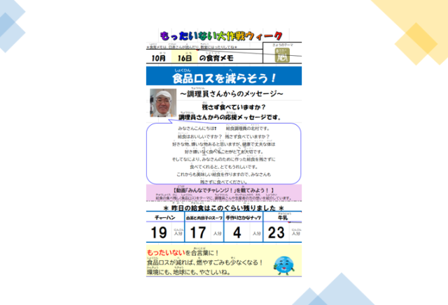 今日はもったいない大作戦ウイーク4日目です。調理員の北村さんのメッセージの載った食育メモです。