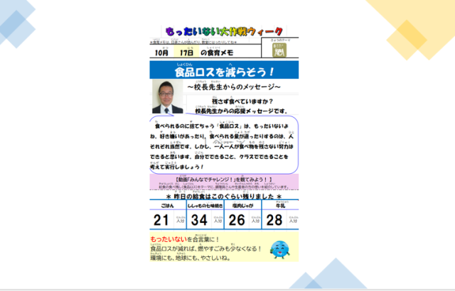 今日はもったいない大作戦ウイーク最終日です。校長先生からメッセージをいただきました。少しでも残りが少なくなってくれると嬉しいです