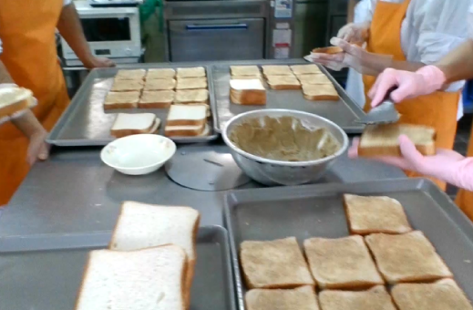 今日は大人気のセサミトーストです。ごま、バター、砂糖で作ったソースを1枚ずつ丁寧にパンに塗って焼きました。