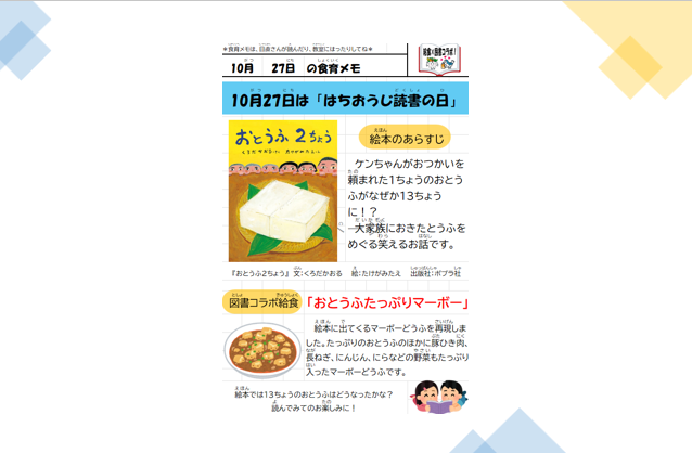 今日は「八王子読書の日」です。給食は絵本「おとうふ2ちょう」とコラボ給食です。給食の時間に見てもらえるように司書の田村先生と事務室と協力して絵本の動画を作り配信しました。