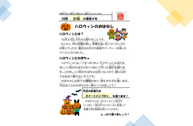 今日はハロウィン❣ 給食ではスイートパンプキンをいただきました。今日はどの献立も大人気です。