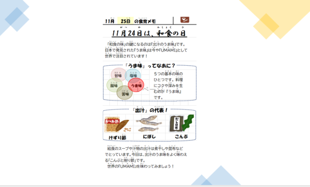 11月24日は「和食の日」でした。松が谷小では今日和食の献立をいただきます。こんぶと削り節でとった出汁のすまし汁は絶品です。