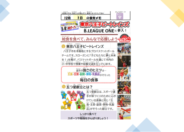 今日は五つ星献立です。 五つ星献立 とは、スポーツ選手 が体 づくりのために心 がけている食事 と同 じ 「主食・主菜・副菜・果物・乳製品 」がそろった献立 です。しっかり食べて、勉強やスポーツを頑張りましょう!!