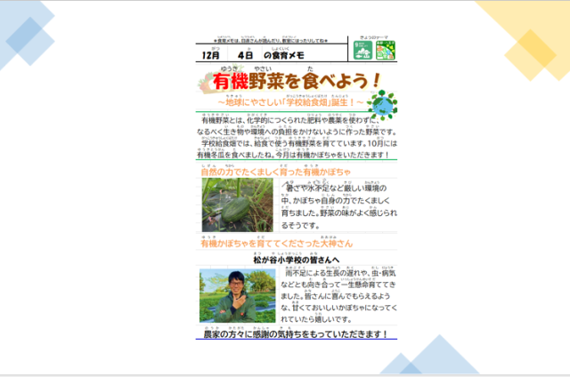 有機野菜とは、化学的につくられた肥料や農薬を使わずに、 なるべく生き物や環境への負担をかけないように作った野菜です。今日は八王子産の有機かぼちゃを使ったカレーライスです。美味しいカレーライスは大人気です。