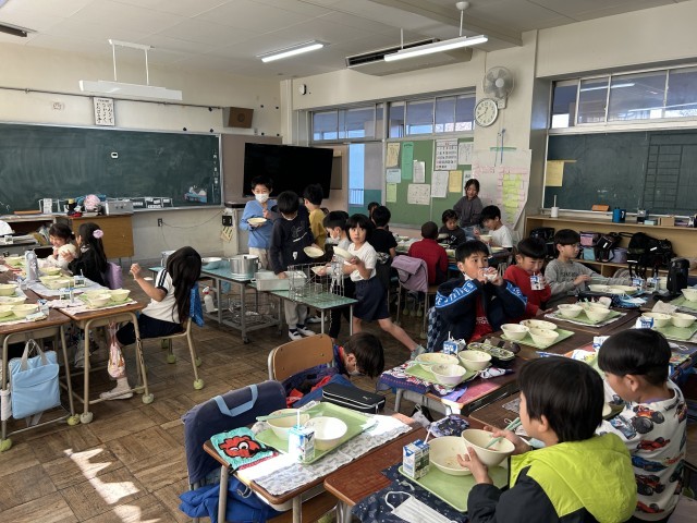 今日は、交流給食で、1・4年生、2・5年生、3・6年生がいっしょに給食を食べました。最初は、みんなお腹が空いていたようで黙々と食べていましたが、落ち着いてきたら、お話しながら、和気あいあいと食べていました。その後は、短い時間でしたが、クイズやジェスチャーゲームなどして、遊びを通して交流を深めていました。