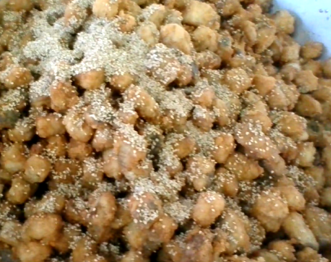 今日のホキのごまがらめは、ホキに根しょうが、酒、しょうゆで下味をつけて、米粉をまぶして油で揚げて、砂糖、しょうゆ、酒、みりん、で作ったたれにからめて、ごまをまぶしました。甘辛い美味しいホキはごはんにピッタリです。