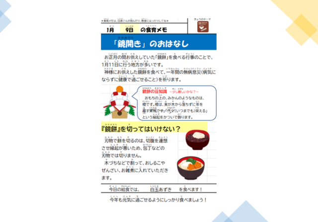 今日から3学期の給食が始まりました。給食室一同、安心・安全・美味しい給食を一生懸命作ってまいります。