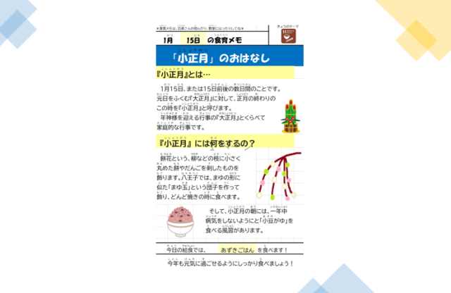 正月の終わりのこの時を『小正月』と呼びます。1月15日、その前後の日のことです。餅花という柳などの枝に小さく丸めた餅や団子を刺したものを飾ります。八王子では、まゆの形に似た「まゆ玉」という団子を作って飾り、どんど焼きの時に食べます。そして、小正月の朝には、一年中病気をしないようにと「小豆がゆ」を食べる風習があります。松が谷小でも今日の給食であずきごはんをいただきます。