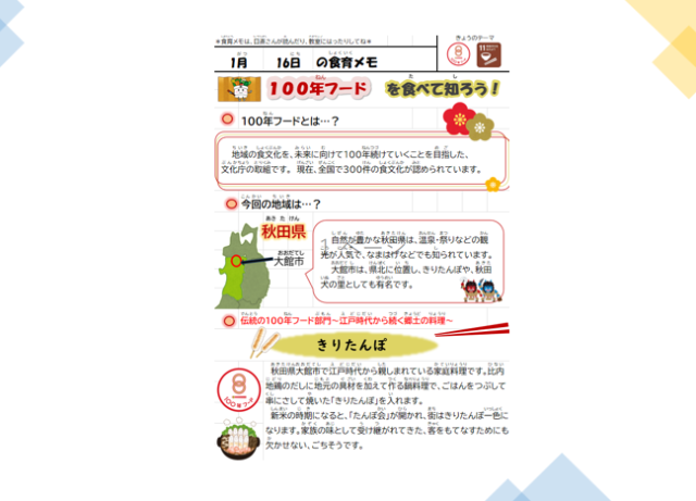 今日は月に一度の100年フードの日です。今回は秋田県大館市 で江戸時代 から親 しまれている家庭料理 「きりたんぽ汁」をいただきます。