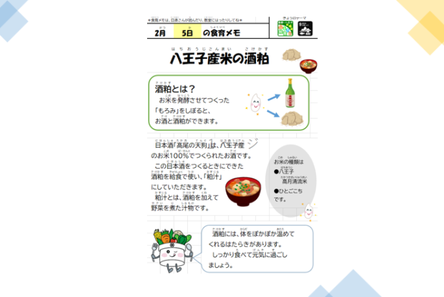 今日の献立の「八王子産の粕汁」は日本酒 「髙尾 の天狗 」(八王子産のお米 100%でつくられたお酒) をつくるときにできた酒粕 を使っています。粕汁 とは、酒粕 を加 えて野菜 を煮 た汁物 です。いつもの汁とはひと味違う美味しさです。