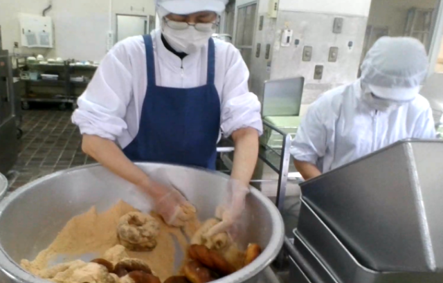 今日は大人気献立「揚げパン」です。今回はあしたばパンのリングの形をしたパンを揚げパンにしました。
