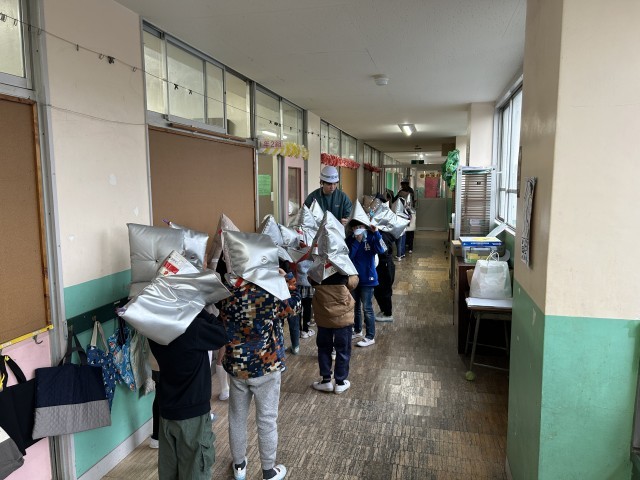廊下までの訓練となりましたが、みんなしっかり取り組むことができました。特に1年生は、放送の指示に従って、静かに、スムーズに対応できていました。1年間、しっかり取り組んできた成果を感じました。