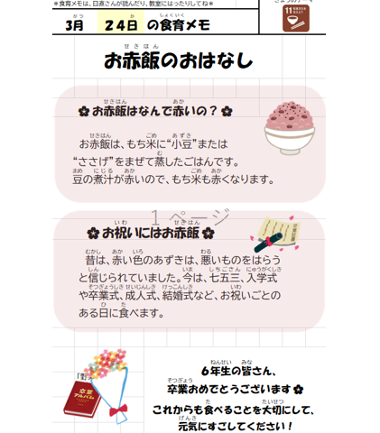 今日は令和7年度最後の給食です。今年度は白衣の修繕・洗濯等ご協力いただきありがとうございました。来年度も安心・安全・美味しい給食作りに給食室一同頑張ります。