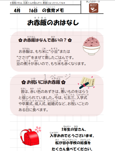 今日は一年生を迎える会がありました。ささやかながら給食室でもお祝い献立を作りました。