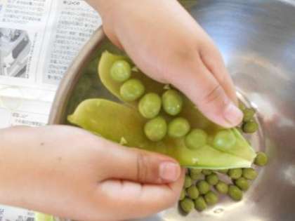 今日は2年生がさやむきをしてくれたグリーンピースのごはんです。