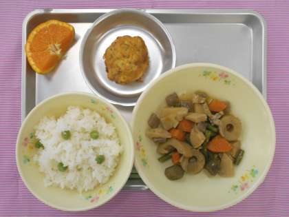 グリーンピースごはん 豆腐のまさご揚げ 野菜の旨煮 カラオレンジ 牛乳