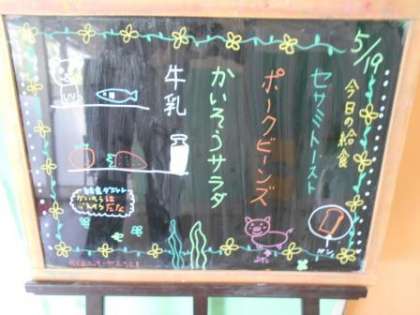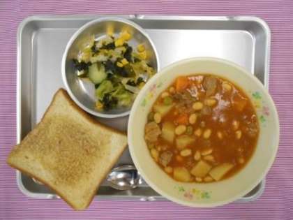 セサミトースト ポークビーンズ 海藻サラダ 牛乳