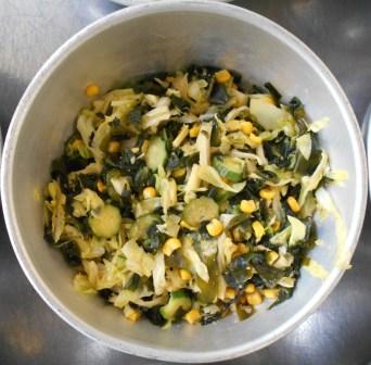 海藻サラダは、カットわかめ・きゅうり・キャベツ・ホールコーン・白ごまを使用しています。キャベツは東京都小平産でした。