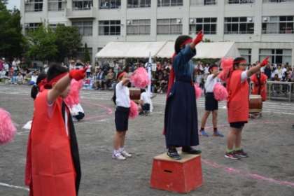プログラム2番は応援合戦です。「ドン、ドン、ドン、ドン、ドン、ドン」と太鼓の響きに合わせて応援団の入場です。