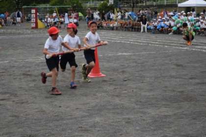 プログラム4番は、3・4年生の団体競技「MATUGAYA ハリケーン」です。竹の棒を3人か4人のチームで持って走り、コーンを2個回って来て、次の人にバトンタッチ。アンカーは最後に全員の足の下と頭の上を通してゴールです。