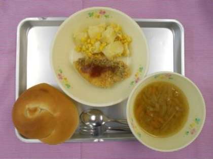 ミルクパン あじフライ コーンポテト 千切り野菜のスープ 牛乳