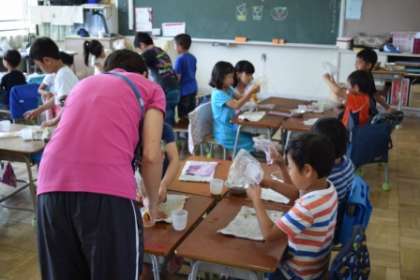 14日(木)1年生の教室では、公園で見つけてきた草や実を使って色水を作っていました。色水ができたら、そこにたたんだ紙を入れて、紙に色をつけます。「見て見て、きれいにできた!」と満足そうでした。