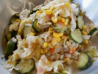 ピナグレッチソースは、細かく切ったトマトや玉ねぎをいれたビネガーソースです。キャベツ・きゅうり・ホールコーンのサラダに和えました。サラダの上には、油で揚げたワンタンの皮をのせてあります。パリパリした食感を楽しめます。