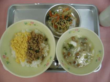 とりにくのそぼろといりたまごをごはんにのせて