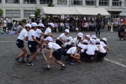 4年生は少し難しくなって、戻ってきたら棒を足の下に通すジャンプ。帰りはしゃがんで頭の上を通して次のチームへ。