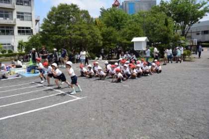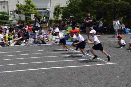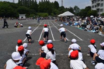 プログラム8番 1年生の個人種目「50m走」です。50mを真っすぐ走っていきます。位置について、ヨーイ、バーン。