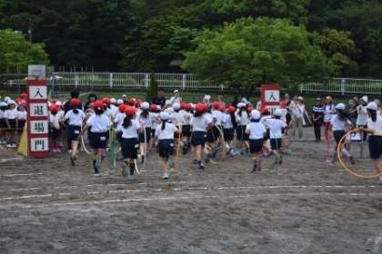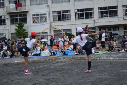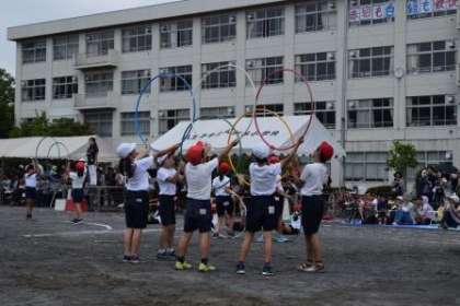 「夢〜東京オリンピック」のフィナーレは、5色のフラフープで五輪・オリンピックマークの完成です。素晴らしい演技の3年生・4年生でした。