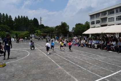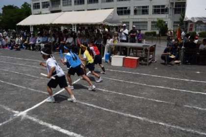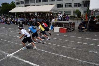 プログラム12番 1年生・2年生・3年生から選抜された選手による「低学年リレー」です。午前の部の最後を飾る低学年リレー。スタートしました。