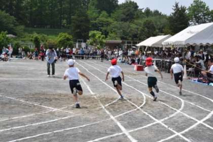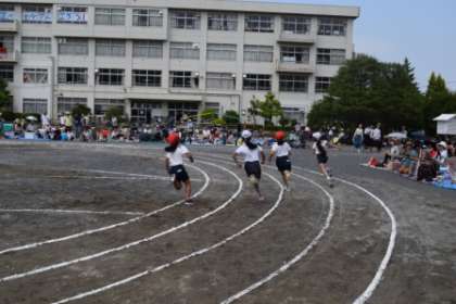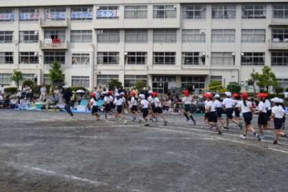 プログラム15番 4年生の個人種目「80m走」です。4年生が入場してきました。トラックを半周してスタート位置へ。コーナーを回って、全速力でゴールへ。