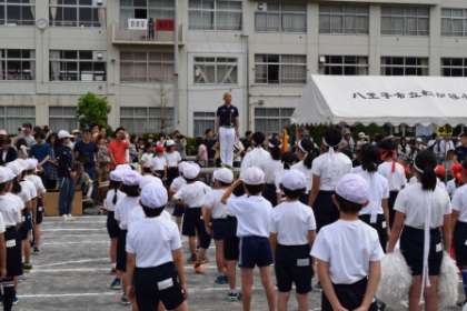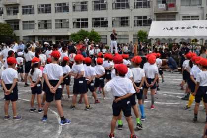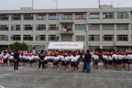 「校長先生のお話です。」今年の運動会のスローガンは、「正々堂々 全力出して 最高の運動会にしよう」です。ルールを守って力一杯やりましょう。