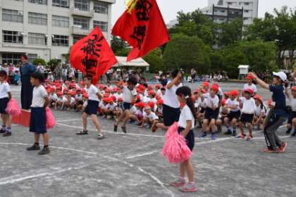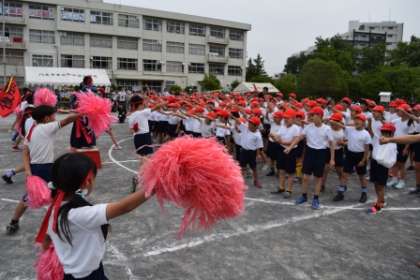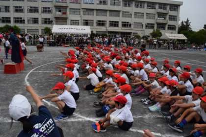 やっと赤組も出ましたね。「がんばろうコール、いくぞー」「オッー」赤も白も元気でいいね。