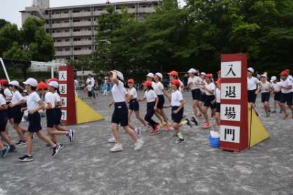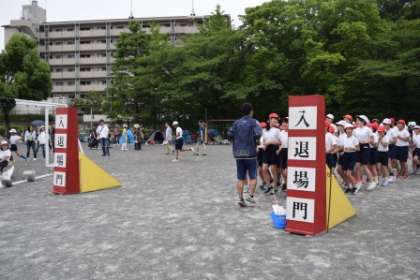 「プログラム6番、6年生による100m走です。」6年生は小学校最後の100m走だよ。入場してきたわ。
