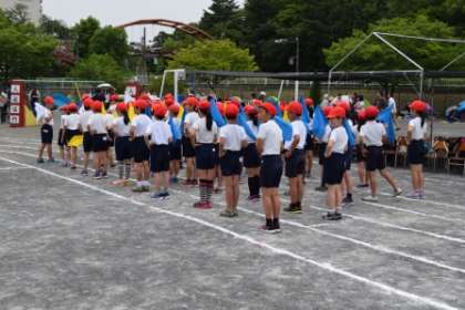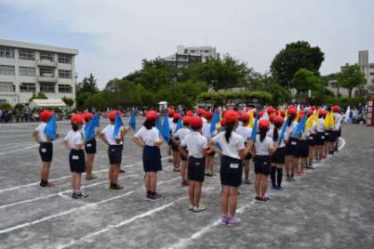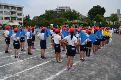 3年生と4年生が旗を持って並んでいるぞ。青、赤、緑、黄色のフラッグよ。色もきれいね。何が始まるのかしら。