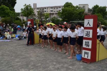 入場門のところで、5年生と6年生が気合いを入れてるよ。これから騎馬戦だからよ。お互いに礼をして、いよいよ始まりだわ。