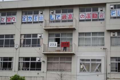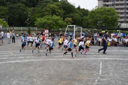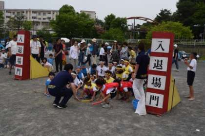 リレーの選手が準備運動してるわ。「プログラム12番、低学年リレーです。」得点は赤237点、白234点で3点差だ。赤も、白もがんばれー。