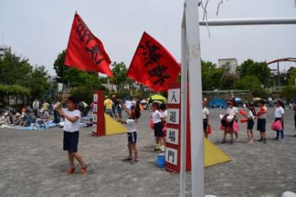 応援団入場門で待機しているよ。午後の応援合戦が始まるのよ。約束通り、今度は赤からじゃ。さあ、スタート。