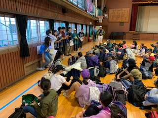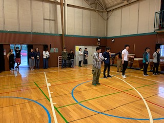 体育館で出発式。