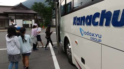 華厳滝が綺麗に見えたことに、子供たちは満足そうでした。バスに乗り、これから宿舎へ。