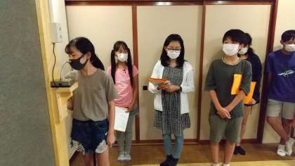 三密を避けるため、宿舎での入所式は放送で行いました。室長さんたちが、丁寧に進行をしました。代表の挨拶をすると、各部屋から拍手やよい返事が聞こえてきました。