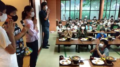 飛沫を避けるため、全員、同じ方向で、「いただきます」。美味しそうなメニューが、歓声を呼びました。