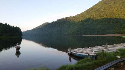 湖畔に来てみました。静かな水面に、釣りを楽しむ人々。遠くからは、野鳥の声が聞こえてきます。