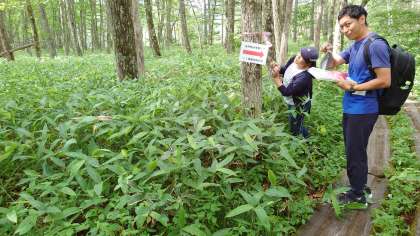 ハイキングをはじめました。教員は、先発して、道案内の表示をしています。