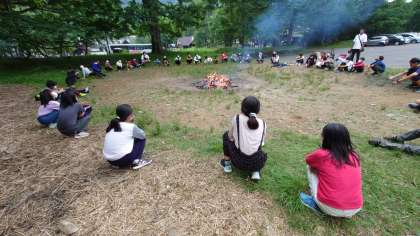 結びに皆で座り、今日1日を振り返ります。焚き火の弾ける音を味っています。