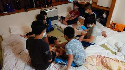 お風呂、お土産タイムが終わり、班ごとに自由に過ごしています。男子部屋を紹介します。