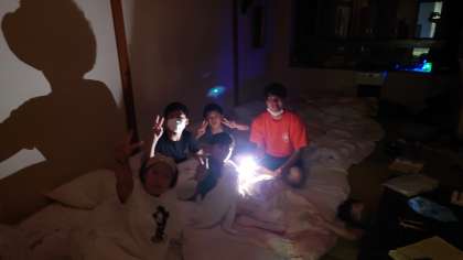 こちらは、男女混ざって、怖い話を始めました。引率者も参加しています。偶然とはいえ、こんな写真になりました。