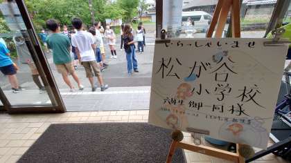 これは、宿舎の女将さん手作りのウエルカムボード。柔らかいタッチの絵と言葉で、松が谷っ子を迎えていただいています。